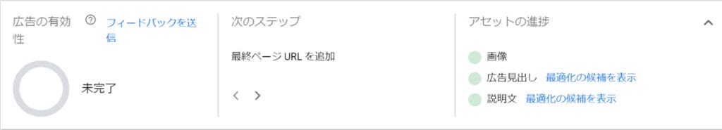 広告の画像や見出し・説明文などの入稿画面の右上に「広告の有効性」という項目があります。