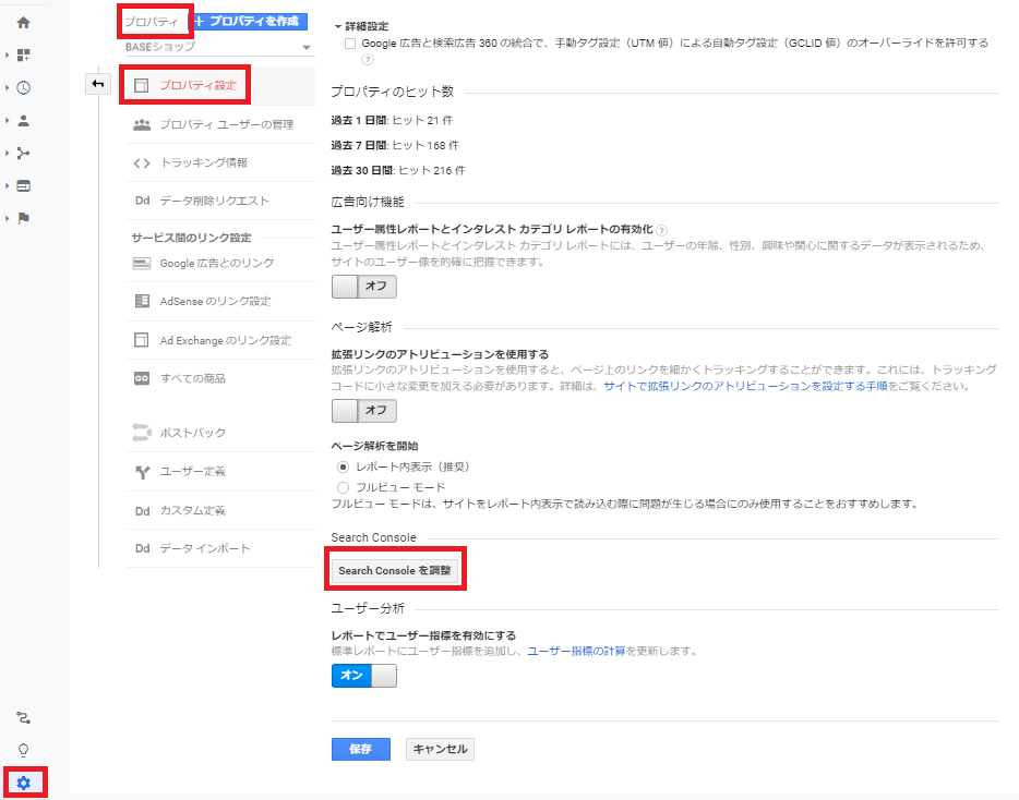 [Googleアナリティクスホーム]→[管理]→[プロパティ]→[プロパティ設定]→[Search Consoleを調整]