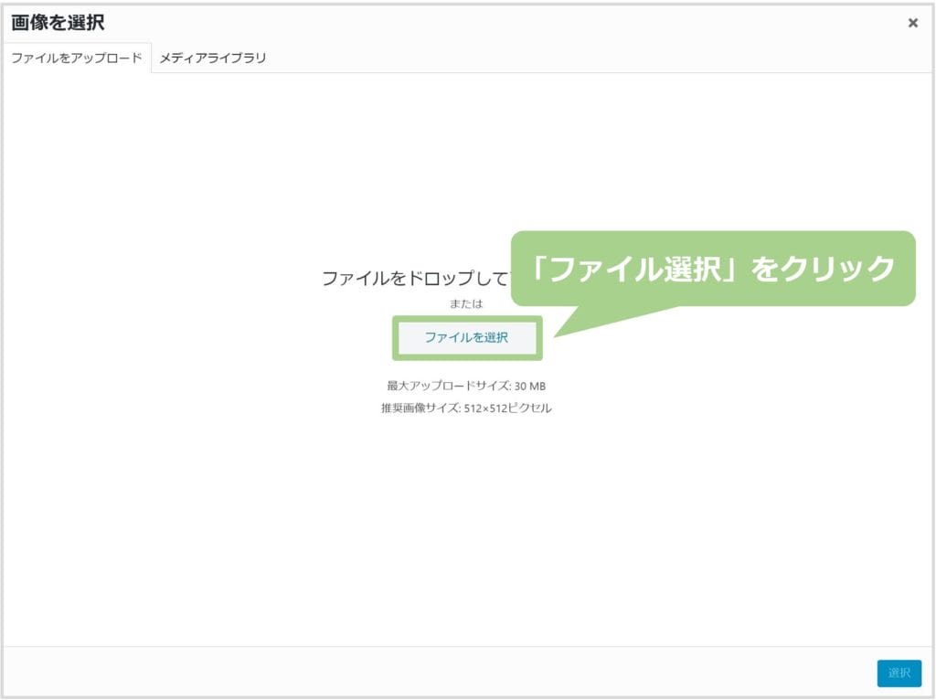 “画像を選択”という画面で、ファビコンにしたい画像が選択されていたら、左下の「選択」をクリックします。