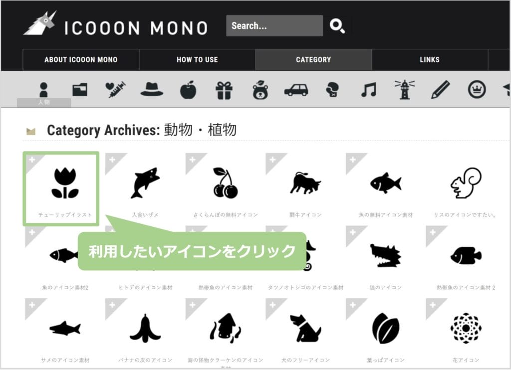 ICOOON MONOにアクセスし、ジャンルを選択します。